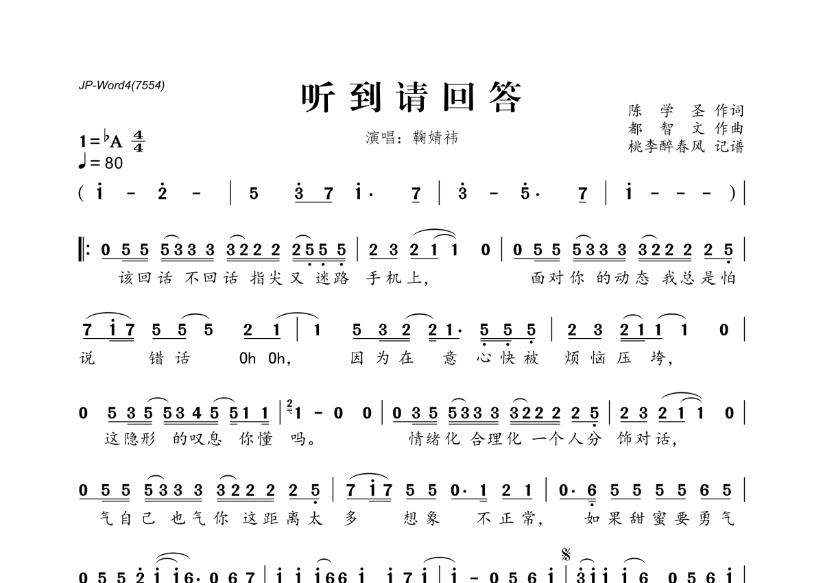 《听到请回答》是鞠婧祎演唱的一首歌曲,拍号为4/4拍,歌曲速度为每分钟80拍,这份简谱共有一张高清图谱,图谱由 @桃李醉春风 编配上传。