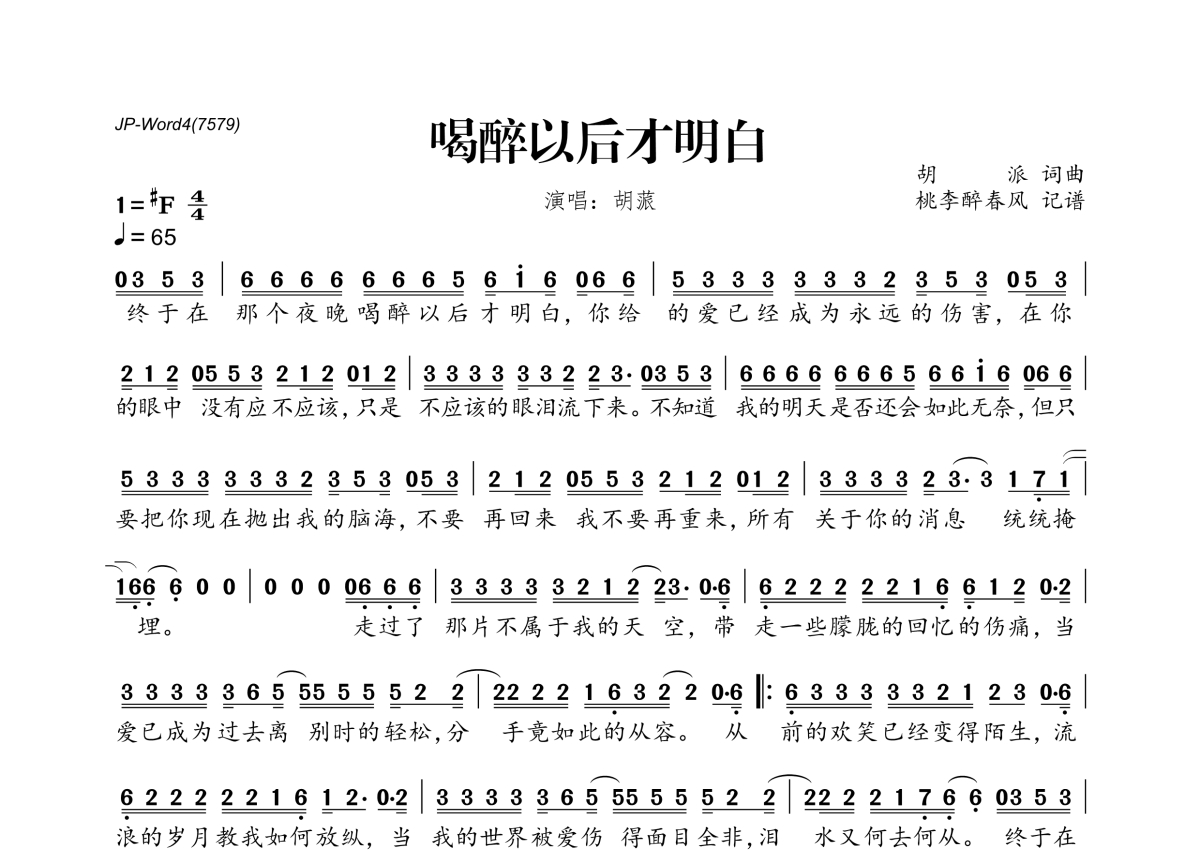 《喝醉以后才明白》是胡蒎演唱的一首歌曲,拍号为4/4拍,歌曲速度为每分钟65拍,这份简谱共有一张高清图谱,图谱由 @桃李醉春风 编配上传。