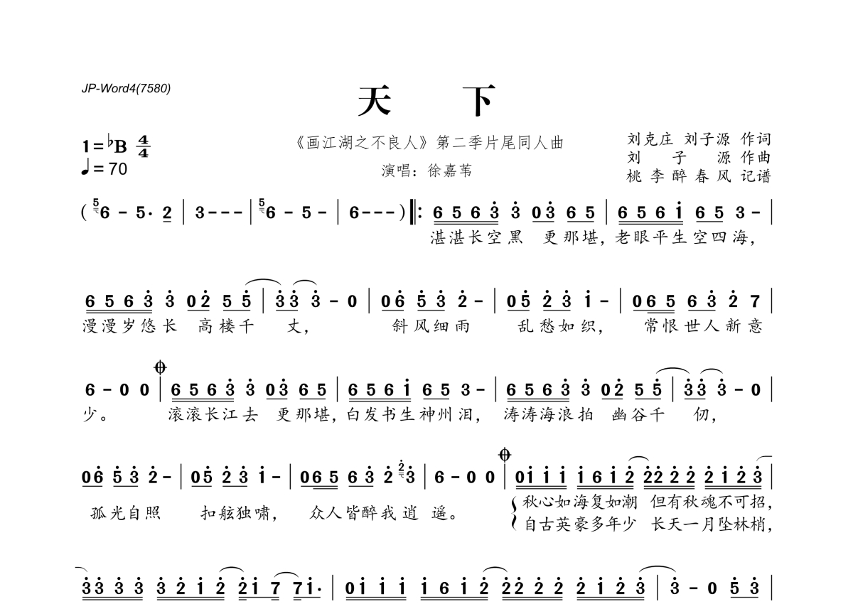 《天下》是徐嘉苇演唱的一首歌曲,拍号为4/4拍,歌曲速度为每分钟70拍,这份简谱共有一张高清图谱,图谱由 @桃李醉春风 编配上传。