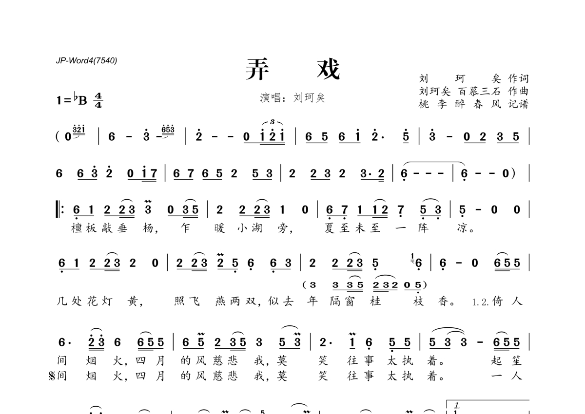 《弄戏》是刘珂矣演唱的一首歌曲,拍号为4/4拍,这份简谱共有一张高清图谱,图谱由 @桃李醉春风 编配上传。