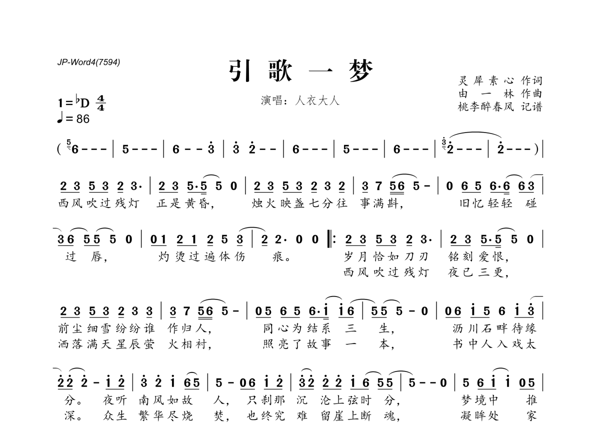 《引歌一梦》是人衣大人演唱的一首歌曲,拍号为4/4拍,歌曲速度为每分钟86拍,这份简谱共有一张高清图谱,图谱由 @桃李醉春风 编配上传。