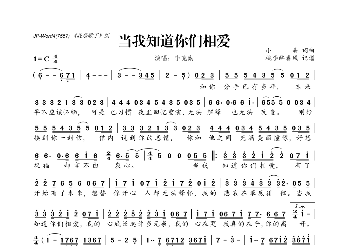 《当我知道你们相爱》是李克勤演唱的一首歌曲,拍号为4/4拍,这份简谱共有一张高清图谱,图谱由 @桃李醉春风 编配上传。