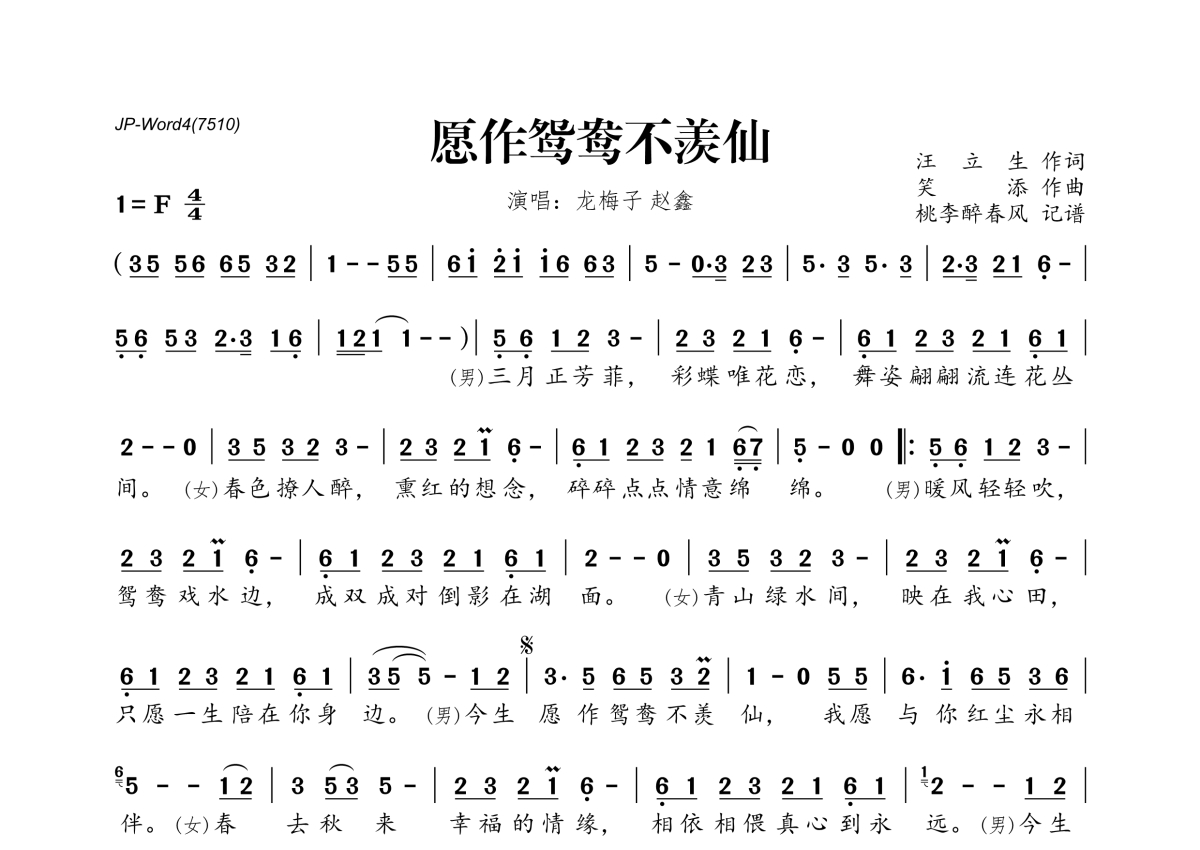 《愿作鸳鸯不羡仙》是赵鑫&龙梅子演唱的一首歌曲,拍号为4/4拍,这份简谱共有一张高清图谱,图谱由 @桃李醉春风 编配上传。