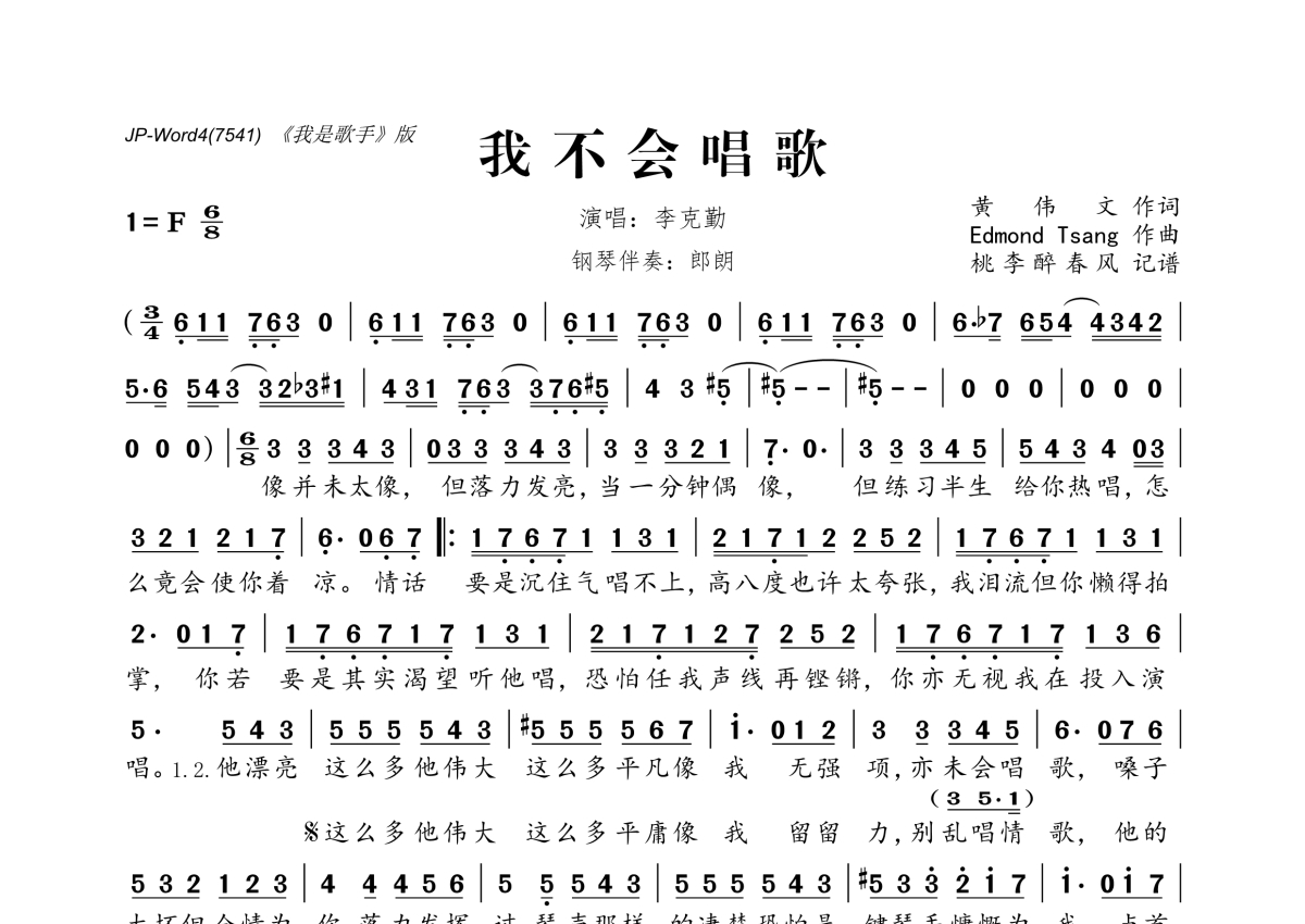 《我不会唱歌》是李克勤演唱的一首歌曲,拍号为6/8拍,这份简谱共有一张高清图谱,图谱由 @桃李醉春风 编配上传。