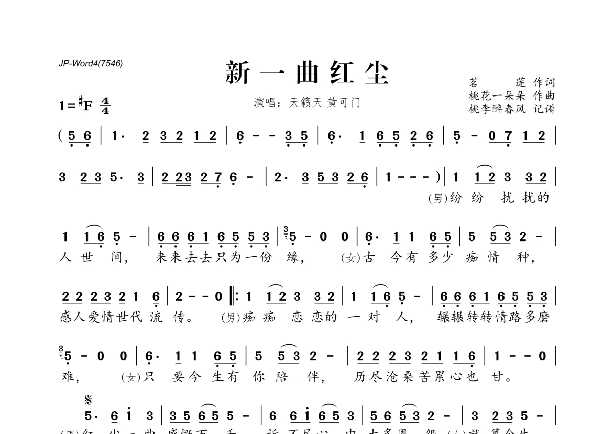 《新一曲红尘》是黄可门&天籁天演唱的一首歌曲,拍号为4/4拍,这份简谱共有一张高清图谱,图谱由 @桃李醉春风 编配上传。