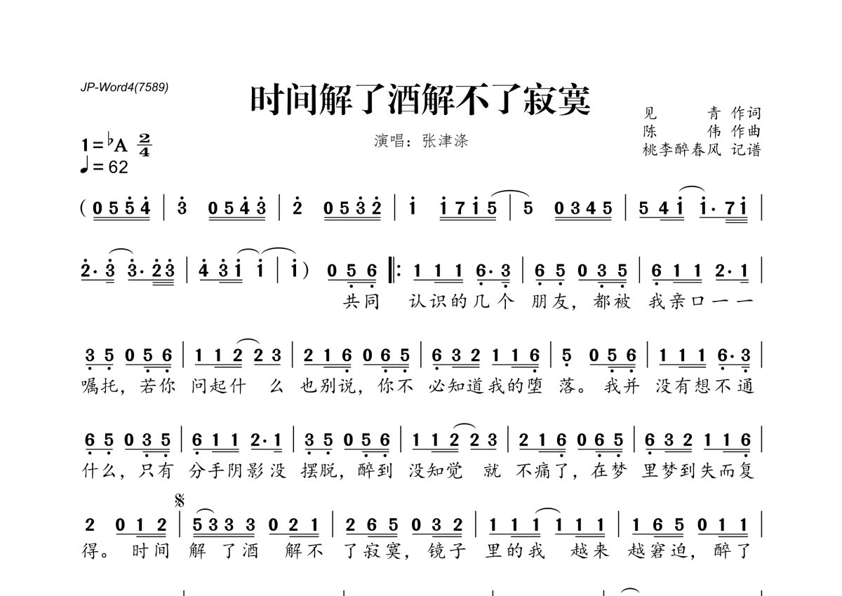 《时间解了酒解不了寂寞》是张津涤演唱的一首歌曲,拍号为2/4拍,歌曲速度为每分钟62拍,这份简谱共有一张高清图谱,图谱由 @桃李醉春风 编配上传。
