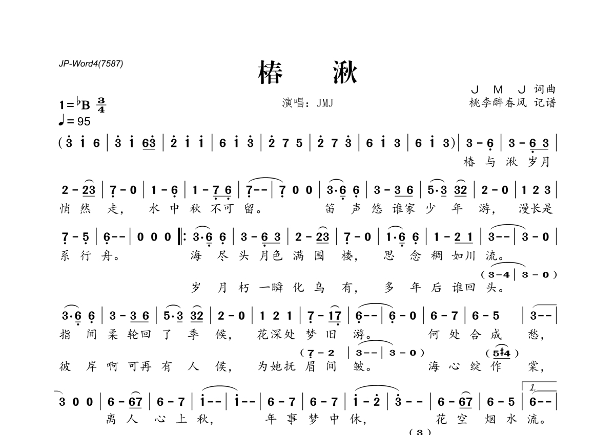 《椿湫》是JMJ演唱的一首歌曲,拍号为3/4拍,歌曲速度为每分钟95拍,这份简谱共有一张高清图谱,图谱由 @桃李醉春风 编配上传。