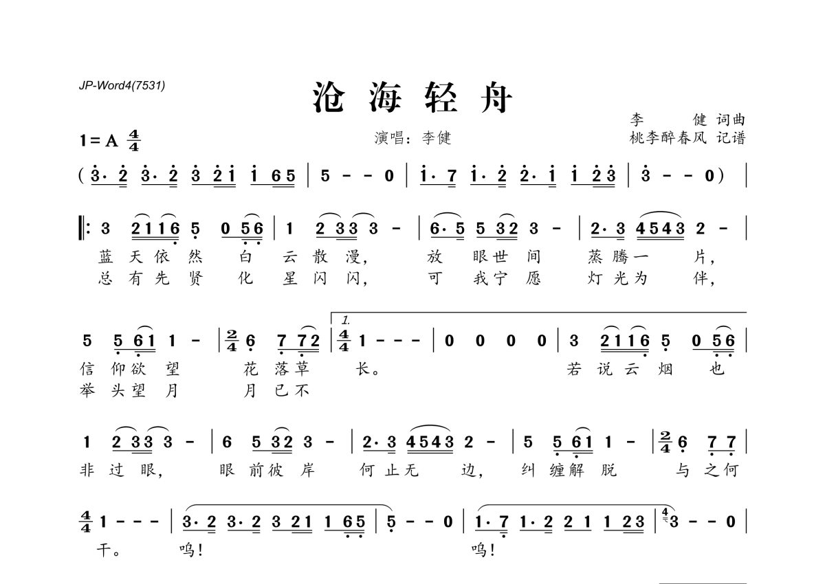 《沧海轻舟》是李健演唱的一首歌曲,拍号为4/4拍,这份简谱共有一张高清图谱,图谱由 @桃李醉春风 编配上传。