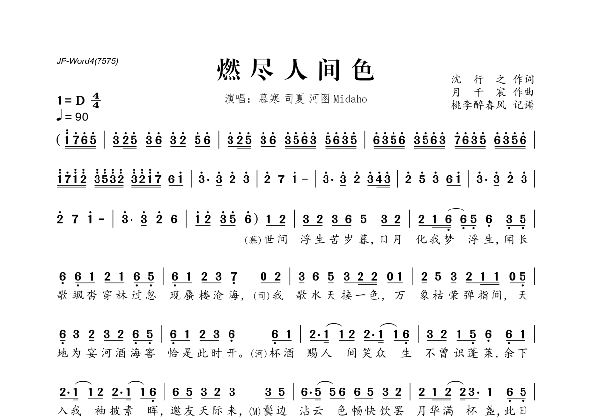 《燃尽人间色》是司夏&慕寒&河图演唱的一首歌曲,拍号为4/4拍,歌曲速度为每分钟90拍,这份简谱共有三张高清图谱,图谱由 @桃李醉春风 编配上传。