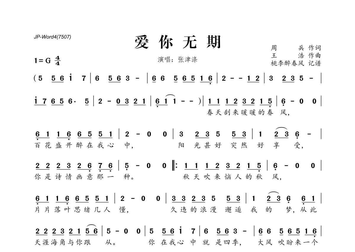 《爱你无期》是张津涤演唱的一首歌曲,拍号为4/4拍,这份简谱共有一张高清图谱,图谱由 @桃李醉春风 编配上传。