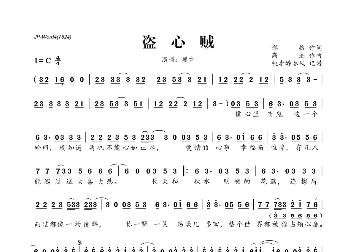 《盗心贼》是黑龙演唱的一首歌曲,拍号为4/4拍,这份简谱共有一张高清图谱,图谱由 @桃李醉春风 编配上传。