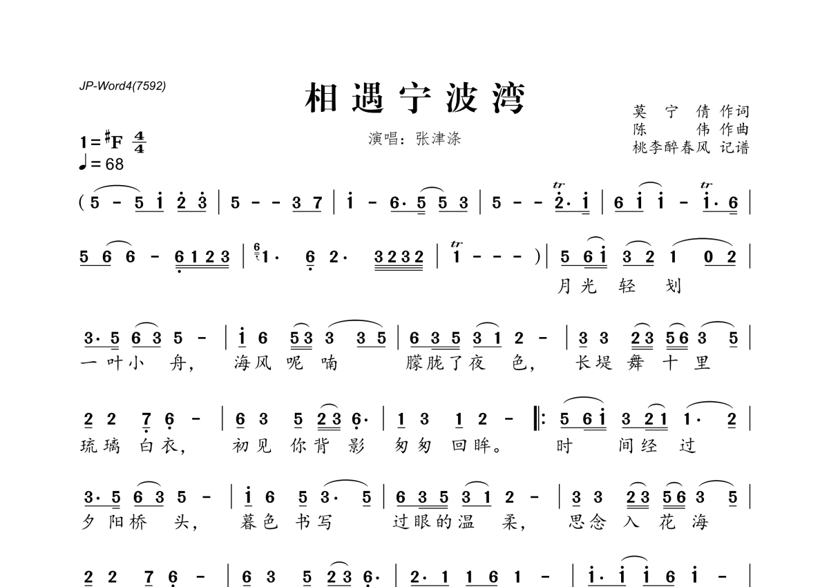 《相遇宁波湾》是张津涤演唱的一首歌曲,拍号为4/4拍,歌曲速度为每分钟68拍,这份简谱共有一张高清图谱,图谱由 @桃李醉春风 编配上传。