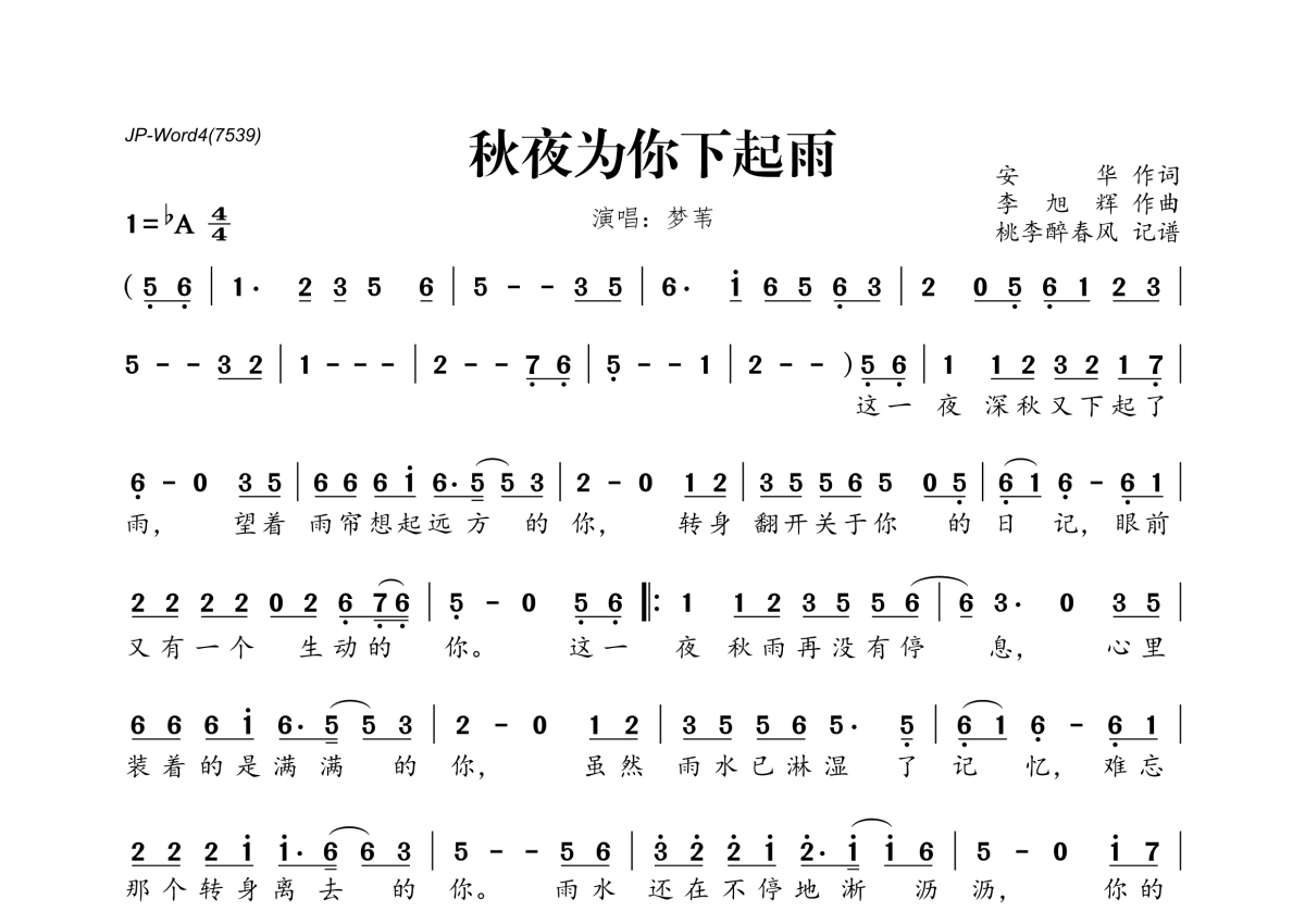 《秋夜为你下起雨》是梦苇演唱的一首歌曲,拍号为4/4拍,这份简谱共有一张高清图谱,图谱由 @桃李醉春风 编配上传。