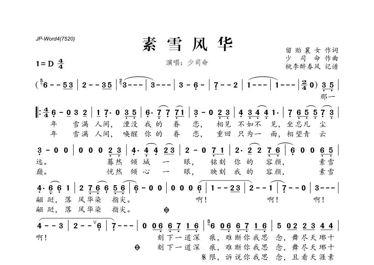 《素雪风华》是少司命演唱的一首歌曲,拍号为4/4拍,这份简谱共有一张高清图谱,图谱由 @桃李醉春风 编配上传。