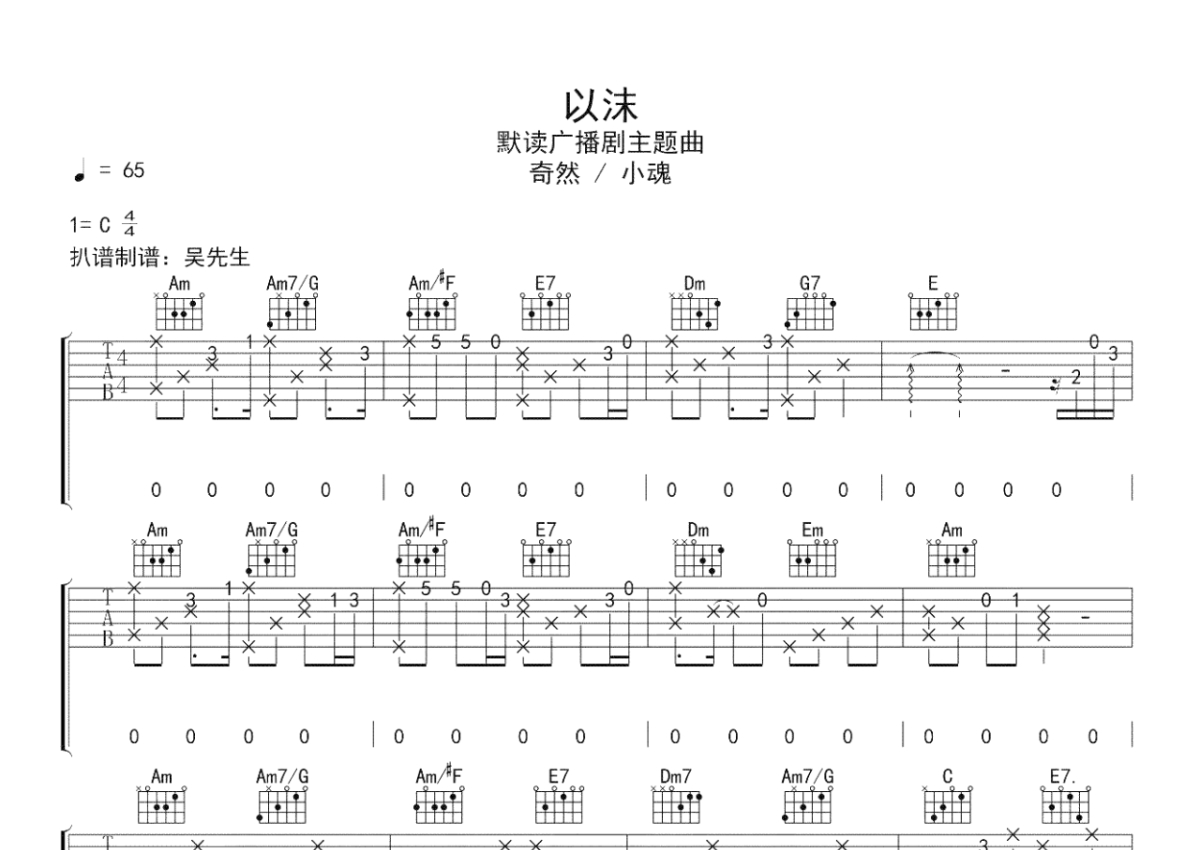 《以沫》是奇然小魂演唱的一首歌曲,本吉他谱采用的是C调指法编配,这份吉他谱共有四张高清图谱,图谱由 @吴先生TAB 编配上传,图谱使用六线谱编配,包含吉他和弦指法、简谱以及歌词部分,使用这份以沫吉他谱,可以让你更加方便地掌握这首歌曲的弹唱技巧,快来尝试吧。奇然小魂《以沫》吉他谱,广播剧《默读》的主题曲,以沫六线谱,C调弹唱完整版。有没有那么一个人,温暖了你心中的荒野,天空海阔只愿与他相濡以沫。纵然路途要披荆斩棘,也不惜一切靠岸停泊。时间会慢慢沉淀,恍惚间,挥霍的光阴,黯淡了往昔的神采。远离荒漠,只为那一瞬星火,随烟波逐流。迷雾中,觥筹交错,过往如明灭的星火,只是你却在心底越来越清晰。在你去的远方,没有黎明不见曙光,而我却愿意同往。即使万丈深渊,即便万劫不复,因为有你在左右,一束微光都可以治愈我的心伤,就算再多的未知与恐惧都将被我打败。岁月静静的流淌,见证着你我的过往,默默的写进时光里永存。万年之后的我们,目光所致,希望那里都是你。