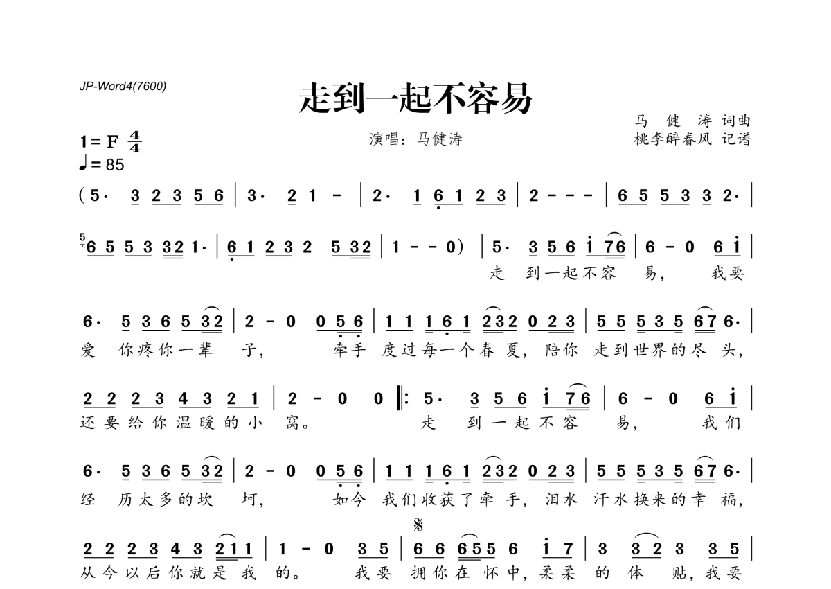 《走到一起不容易》是马健涛演唱的一首歌曲,拍号为4/4拍,歌曲速度为每分钟85拍,这份简谱共有一张高清图谱,图谱由 @桃李醉春风 编配上传。