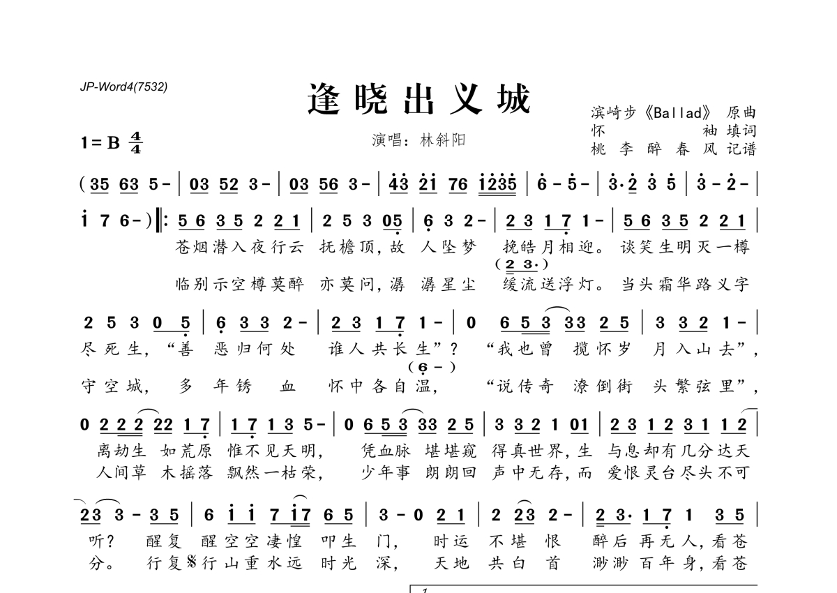 《逢晓出义城》是林斜阳演唱的一首歌曲,拍号为4/4拍,这份简谱共有一张高清图谱,图谱由 @桃李醉春风 编配上传。