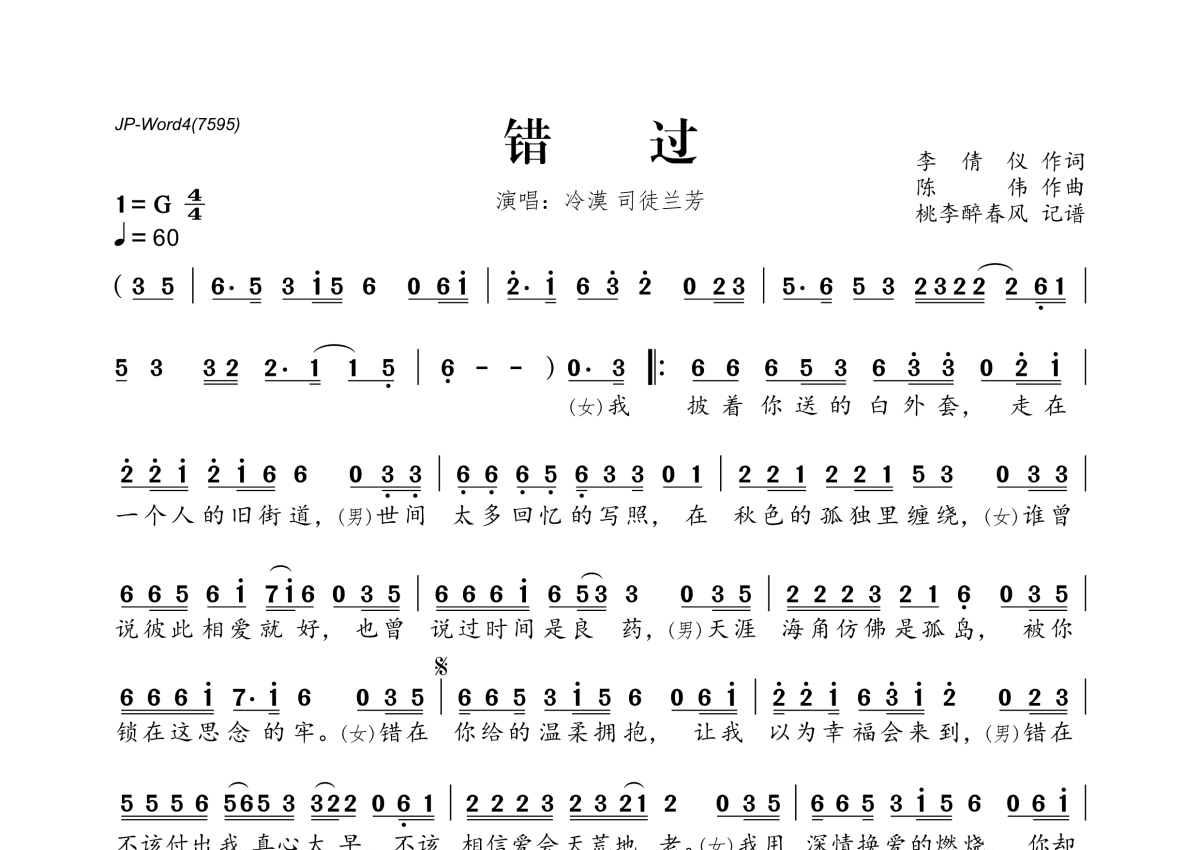 《错过》是冷漠&司徒兰芳演唱的一首歌曲,拍号为4/4拍,歌曲速度为每分钟60拍,这份简谱共有一张高清图谱,图谱由 @桃李醉春风 编配上传。