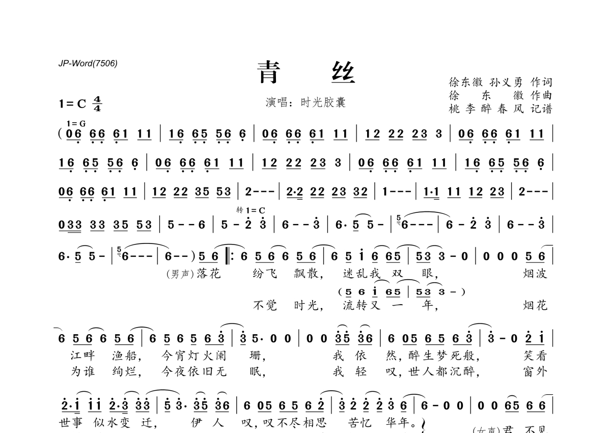 《青丝》是时光胶囊演唱的一首歌曲,拍号为4/4拍,这份简谱共有一张高清图谱,图谱由 @桃李醉春风 编配上传。