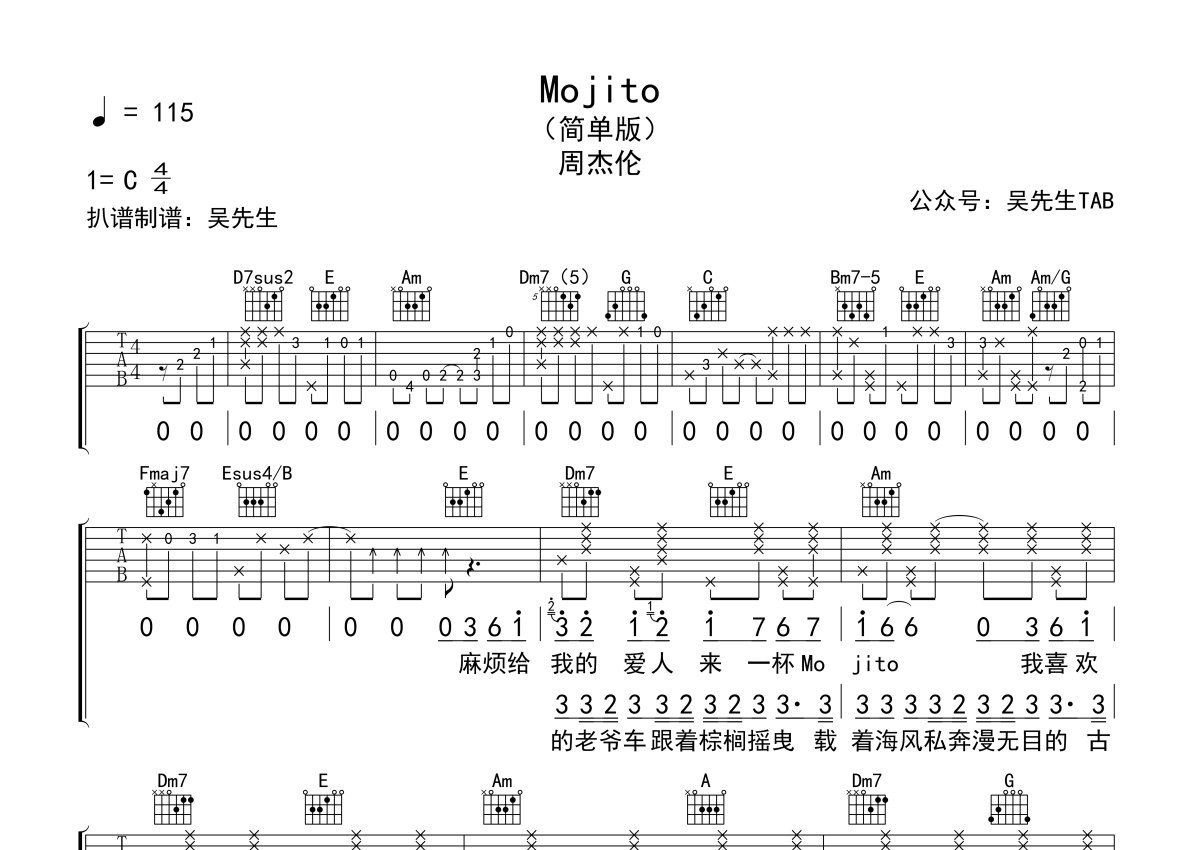 《Mojito》是周杰伦演唱的一首歌曲,简单版,本吉他谱采用的是C调指法编配,这份吉他谱共有两张高清图谱,图谱由 @吴先生TAB 编配上传,图谱使用六线谱编配,包含吉他和弦指法、简谱以及歌词部分,使用这份Mojito吉他谱,可以让你更加方便地掌握这首歌曲的弹唱技巧,快来尝试吧。周杰伦《Mojito》吉他谱_C调吉他弹唱谱_简单版。
