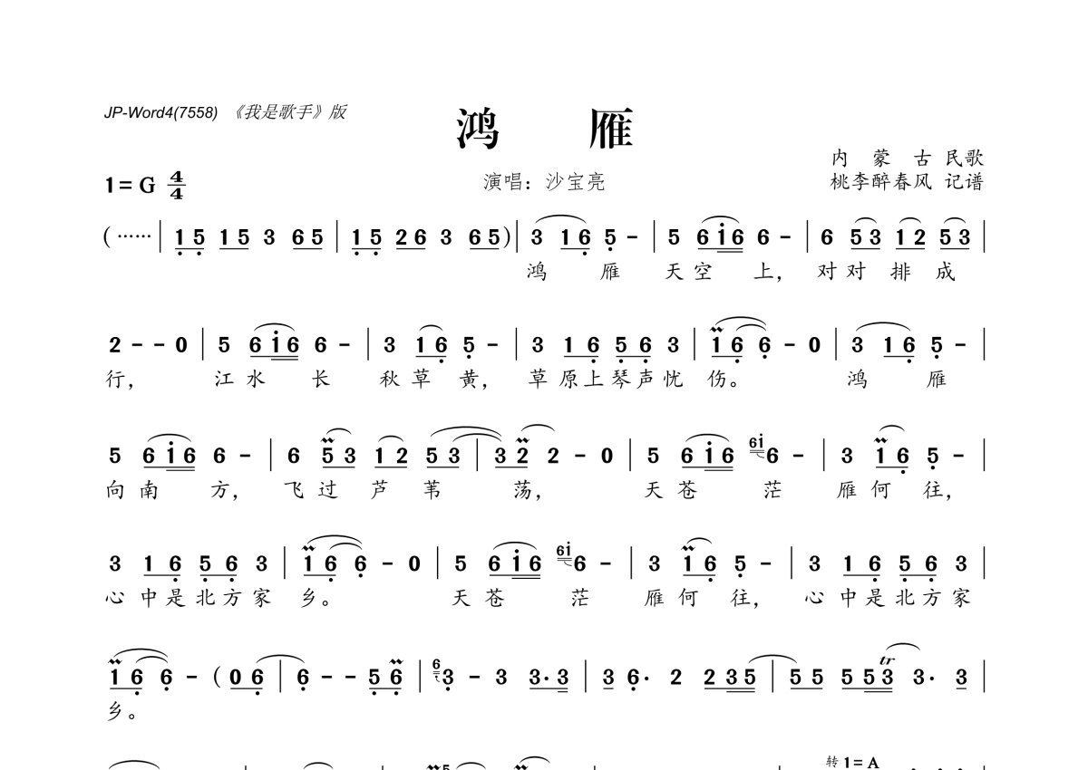 鸿雁简谱 - 沙宝亮演唱