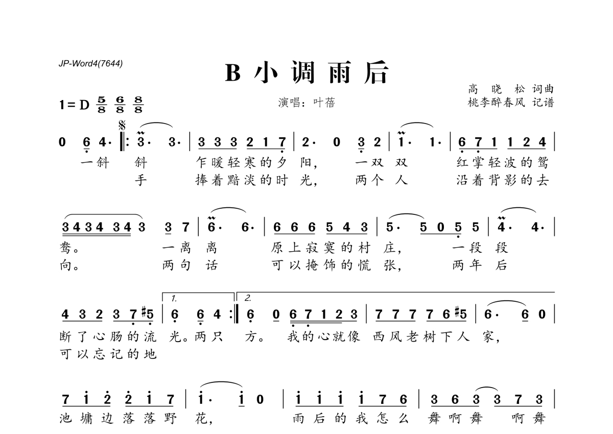 《B小调雨后》是叶蓓演唱的一首歌曲,这份简谱共有一张高清图谱,图谱由 @桃李醉春风 编配上传。