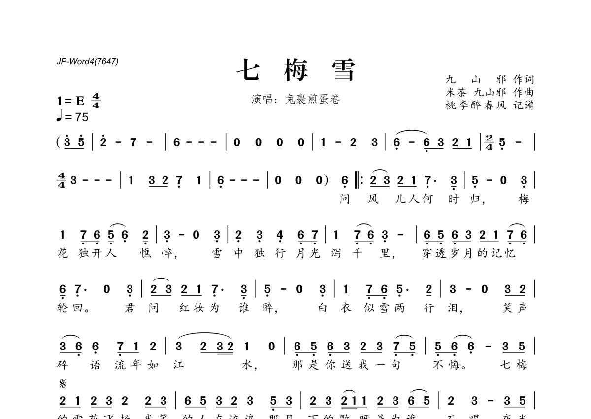 《七梅雪》是兔裹煎蛋卷演唱的一首歌曲,拍号为4/4拍,歌曲速度为每分钟75拍,这份简谱共有一张高清图谱,图谱由 @桃李醉春风 编配上传。