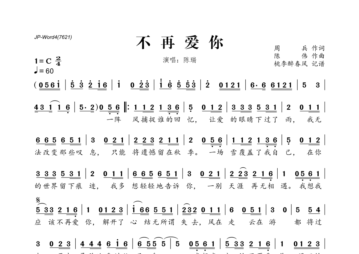 《不再爱你》是陈瑞演唱的一首歌曲,拍号为2/4拍,歌曲速度为每分钟60拍,这份简谱共有一张高清图谱,图谱由 @桃李醉春风 编配上传。