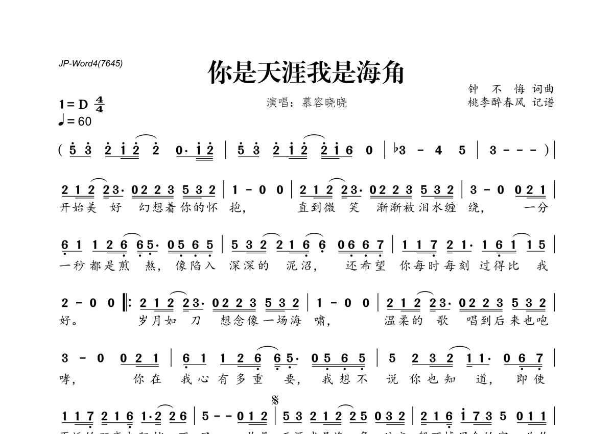 《你是天涯我是海角》是慕容晓晓演唱的一首歌曲,拍号为4/4拍,歌曲速度为每分钟60拍,这份简谱共有一张高清图谱,图谱由 @桃李醉春风 编配上传。