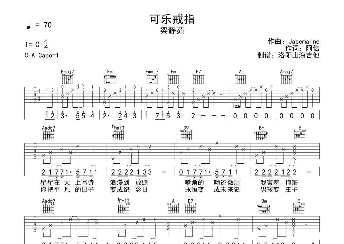 《可乐戒指》是梁静茹演唱的一首歌曲,本吉他谱采用的是A调指法编配,这份吉他谱共有两张高清图谱,图谱由 @何奔洋 编配上传,图谱使用六线谱编配,包含吉他和弦指法、简谱以及歌词部分,曲谱配备了相关的音频提供试听,使用这份可乐戒指吉他谱,可以让你更加方便地掌握这首歌曲的弹唱技巧,快来尝试吧。梁静茹《可乐戒指》吉他谱_A调吉他弹唱谱。
