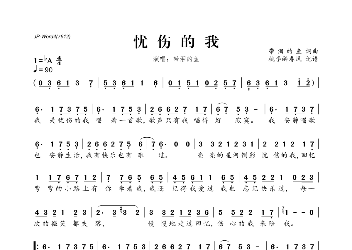 《忧伤的我》是带泪的鱼(戴丽丽)演唱的一首歌曲,拍号为4/4拍,歌曲速度为每分钟90拍,这份简谱共有两张高清图谱,图谱由 @桃李醉春风 编配上传。