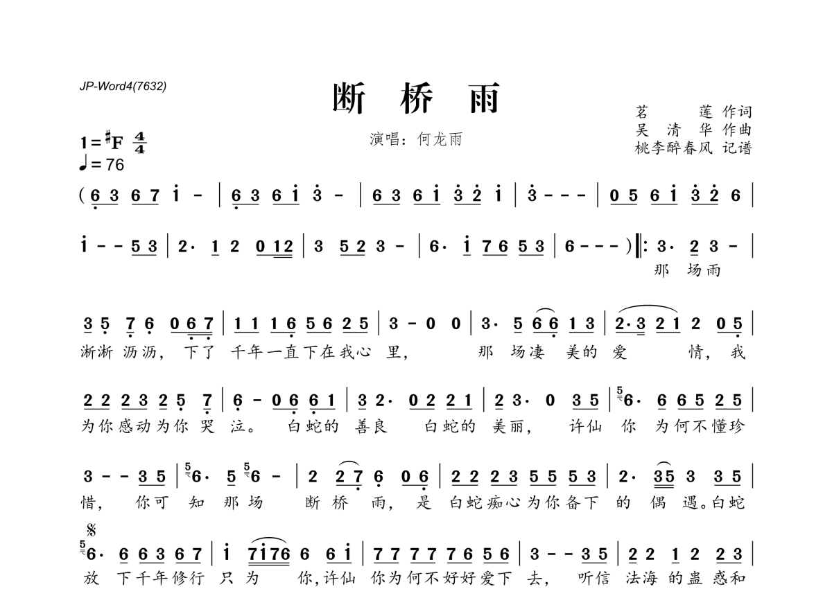 《断桥雨》是何龙雨演唱的一首歌曲,拍号为4/4拍,歌曲速度为每分钟76拍,这份简谱共有一张高清图谱,图谱由 @桃李醉春风 编配上传。