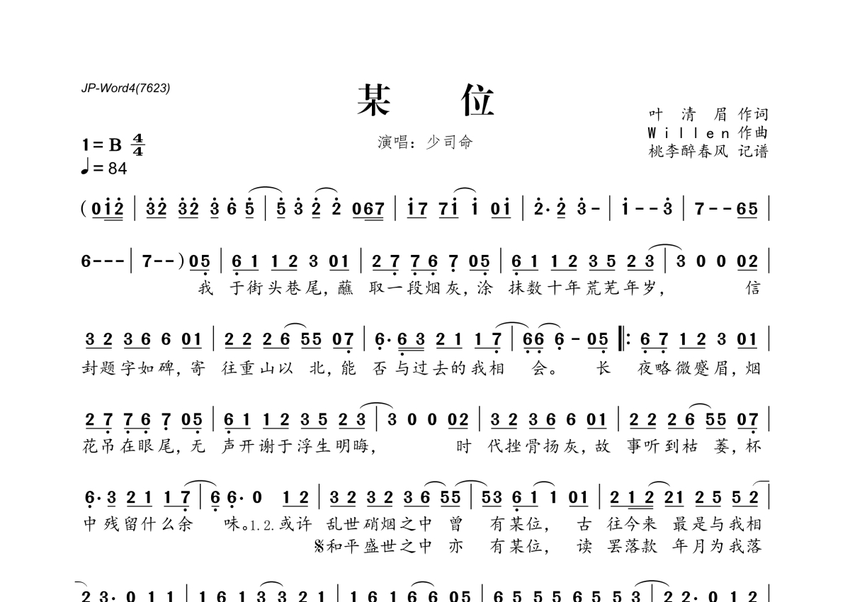 《某位》是少司命演唱的一首歌曲,拍号为4/4拍,歌曲速度为每分钟84拍,这份简谱共有一张高清图谱,图谱由 @桃李醉春风 编配上传。