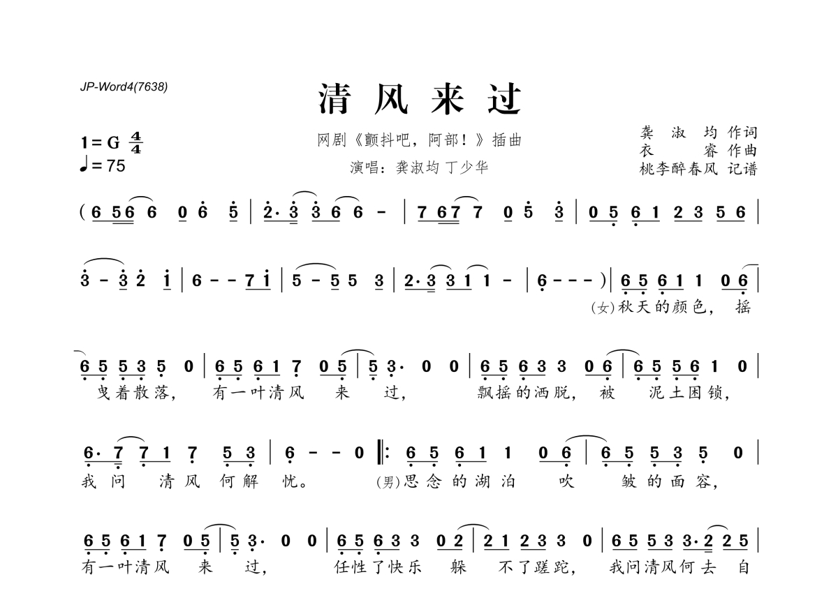 《清风来过》是龚淑均&丁少华演唱的一首歌曲,拍号为4/4拍,歌曲速度为每分钟75拍,这份简谱共有两张高清图谱,图谱由 @桃李醉春风 编配上传。