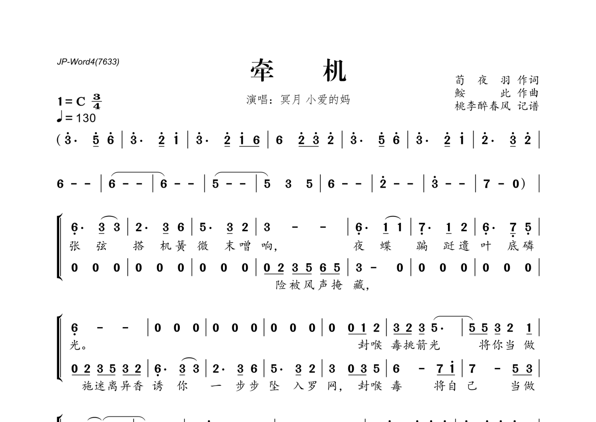 《牵机》是冥月&小爱的妈演唱的一首歌曲,拍号为3/4拍,歌曲速度为每分钟130拍,这份简谱共有三张高清图谱,图谱由 @桃李醉春风 编配上传。