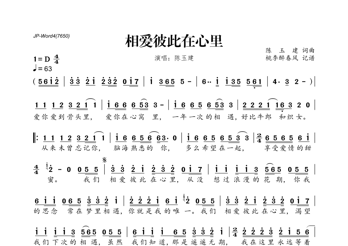 《相爱彼此在心里》是陈玉建演唱的一首歌曲,拍号为4/4拍,歌曲速度为每分钟63拍,这份简谱共有一张高清图谱,图谱由 @桃李醉春风 编配上传。