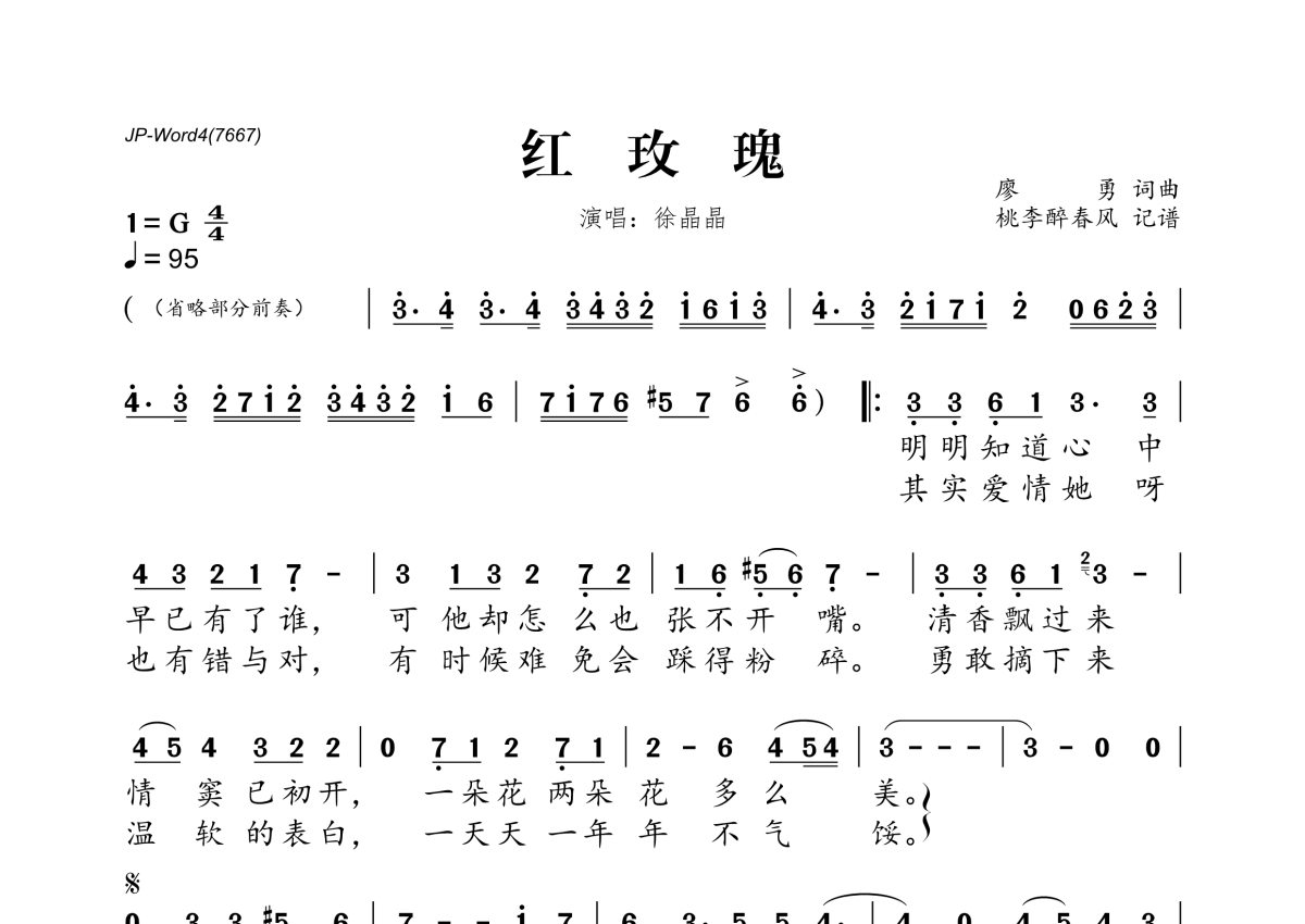 《红玫瑰》是徐晶晶演唱的一首歌曲,拍号为4/4拍,歌曲速度为每分钟95拍,这份简谱共有一张高清图谱,图谱由 @桃李醉春风 编配上传。