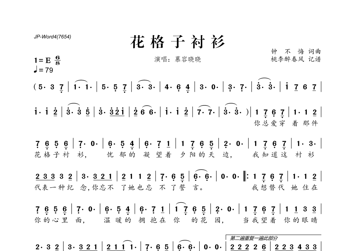《花格子衬衫》是慕容晓晓演唱的一首歌曲,拍号为6/8拍,歌曲速度为每分钟79拍,这份简谱共有一张高清图谱,图谱由 @桃李醉春风 编配上传。