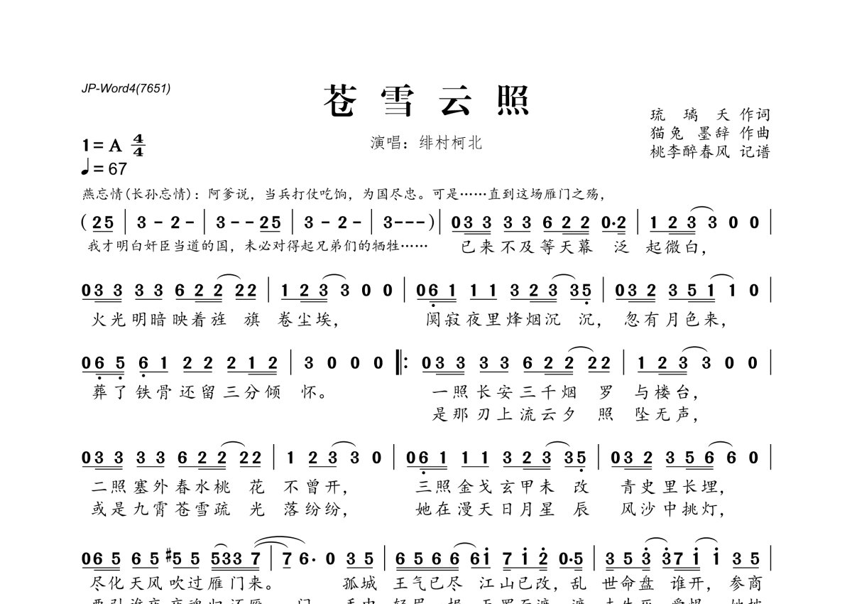 绯村柯北《苍雪云照》简谱