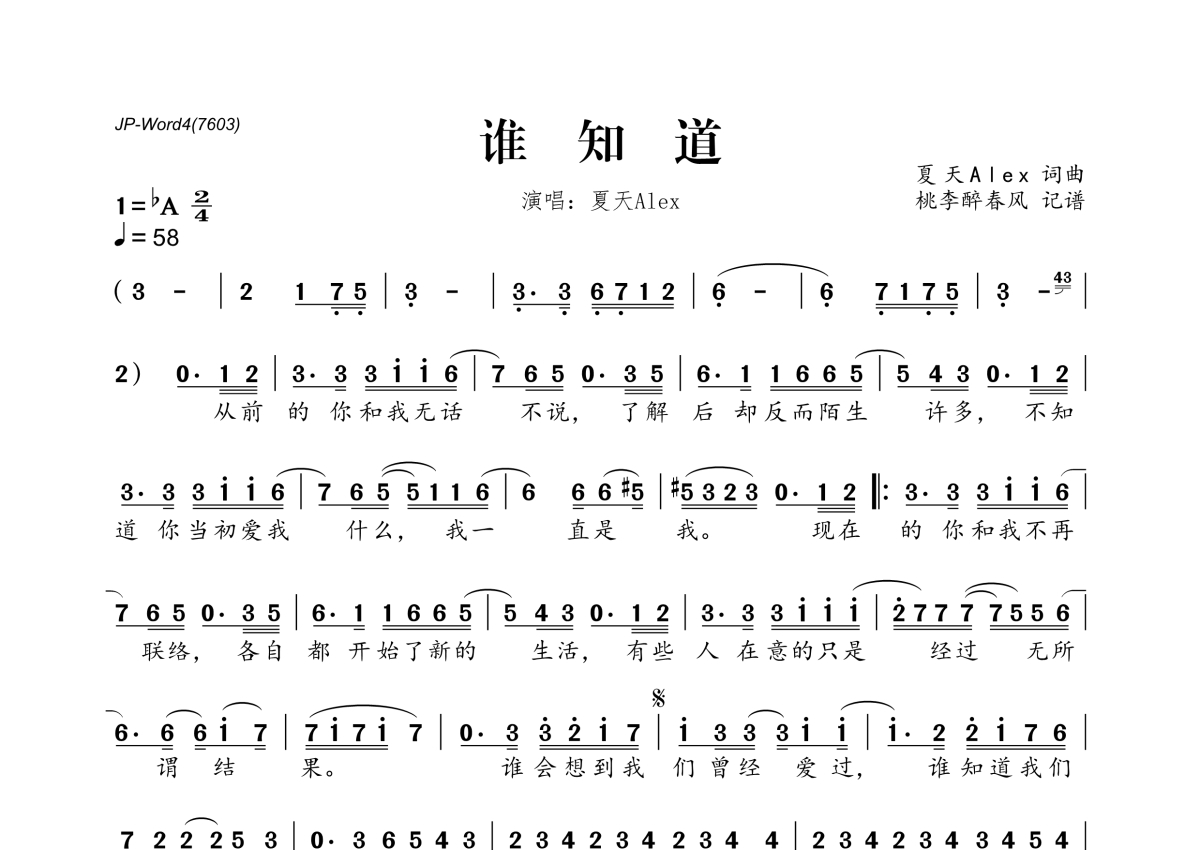 《谁知道》是夏天Alex演唱的一首歌曲,拍号为2/4拍,歌曲速度为每分钟58拍,这份简谱共有一张高清图谱,图谱由 @桃李醉春风 编配上传。
