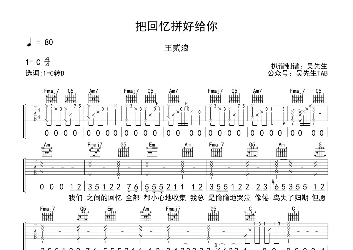王贰浪《把回忆拼好给你》吉他谱 - C调弹唱六线谱