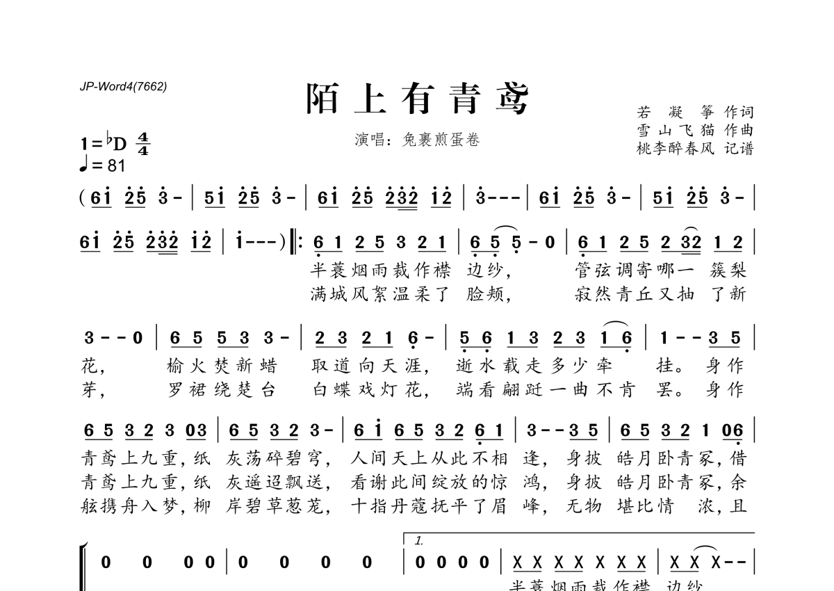 陌上有青鸢简谱 - 兔裹煎蛋卷演唱