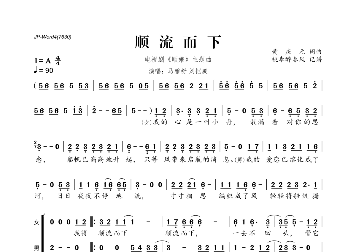 《顺流而下》是马雅舒、刘恺威演唱的一首歌曲,拍号为4/4拍,歌曲速度为每分钟90拍,这份简谱共有两张高清图谱,图谱由 @桃李醉春风 编配上传。