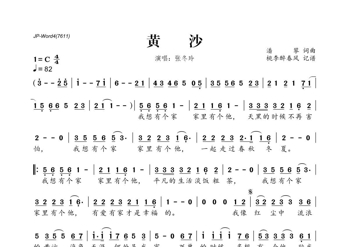 《黄沙》是张冬玲演唱的一首歌曲,拍号为4/4拍,歌曲速度为每分钟82拍,这份简谱共有一张高清图谱,图谱由 @桃李醉春风 编配上传。