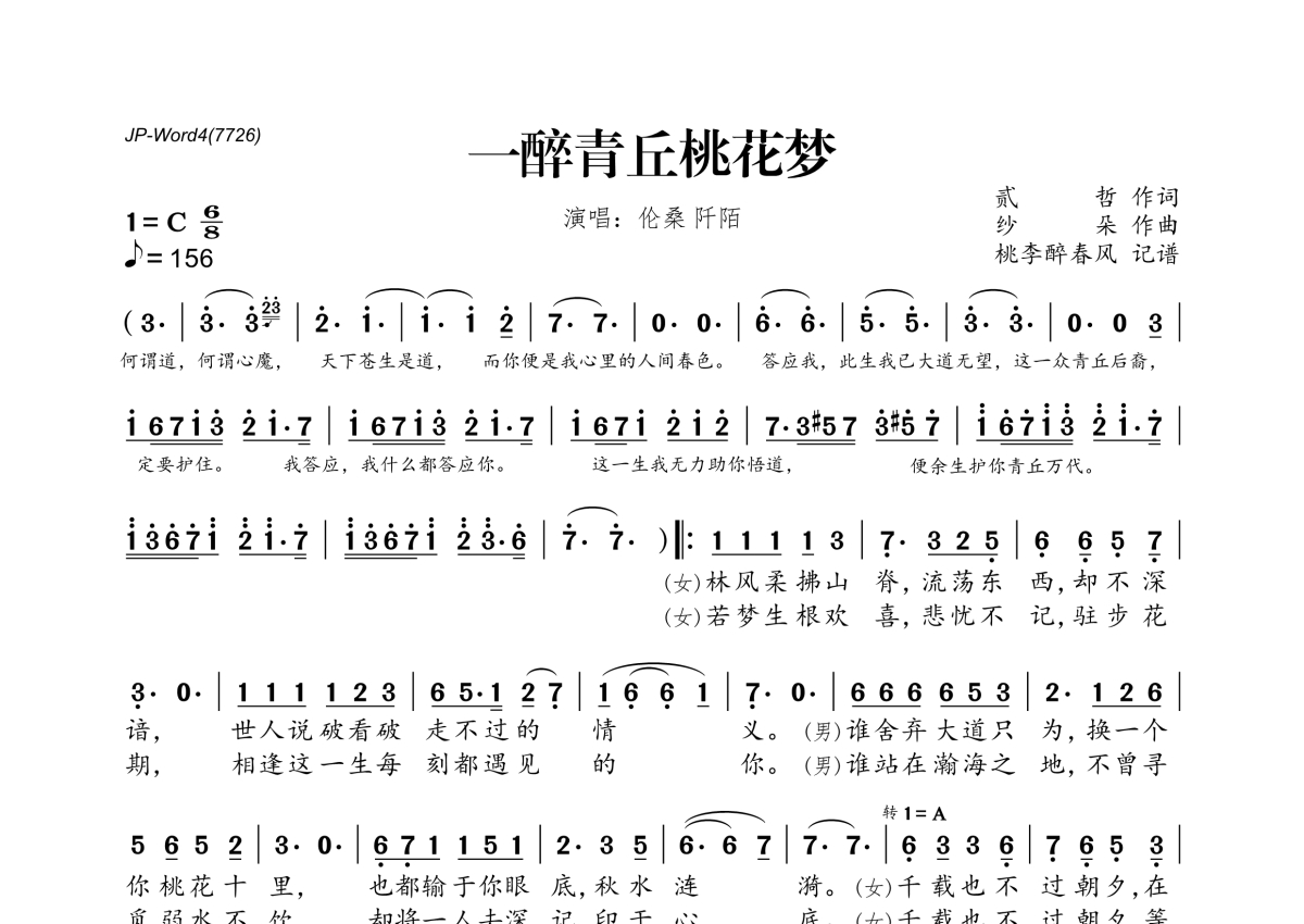 《一醉青丘桃花梦》是伦桑阡陌演唱的一首歌曲,拍号为6/8拍,歌曲速度为每分钟156拍,这份简谱共有一张高清图谱,图谱由 @桃李醉春风 编配上传。