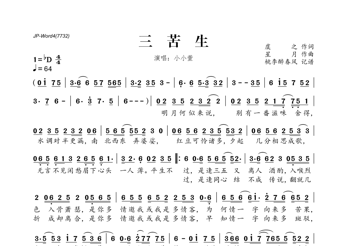 《三苦生》是小小萱演唱的一首歌曲,拍号为4/4拍,歌曲速度为每分钟64拍,这份简谱共有一张高清图谱,图谱由 @桃李醉春风 编配上传。