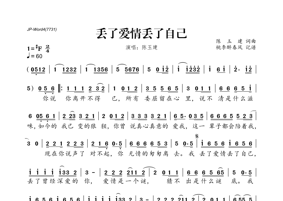 《丢了爱情丢了自己》是陈玉建演唱的一首歌曲,拍号为2/4拍,歌曲速度为每分钟60拍,这份简谱共有一张高清图谱,图谱由 @桃李醉春风 编配上传。