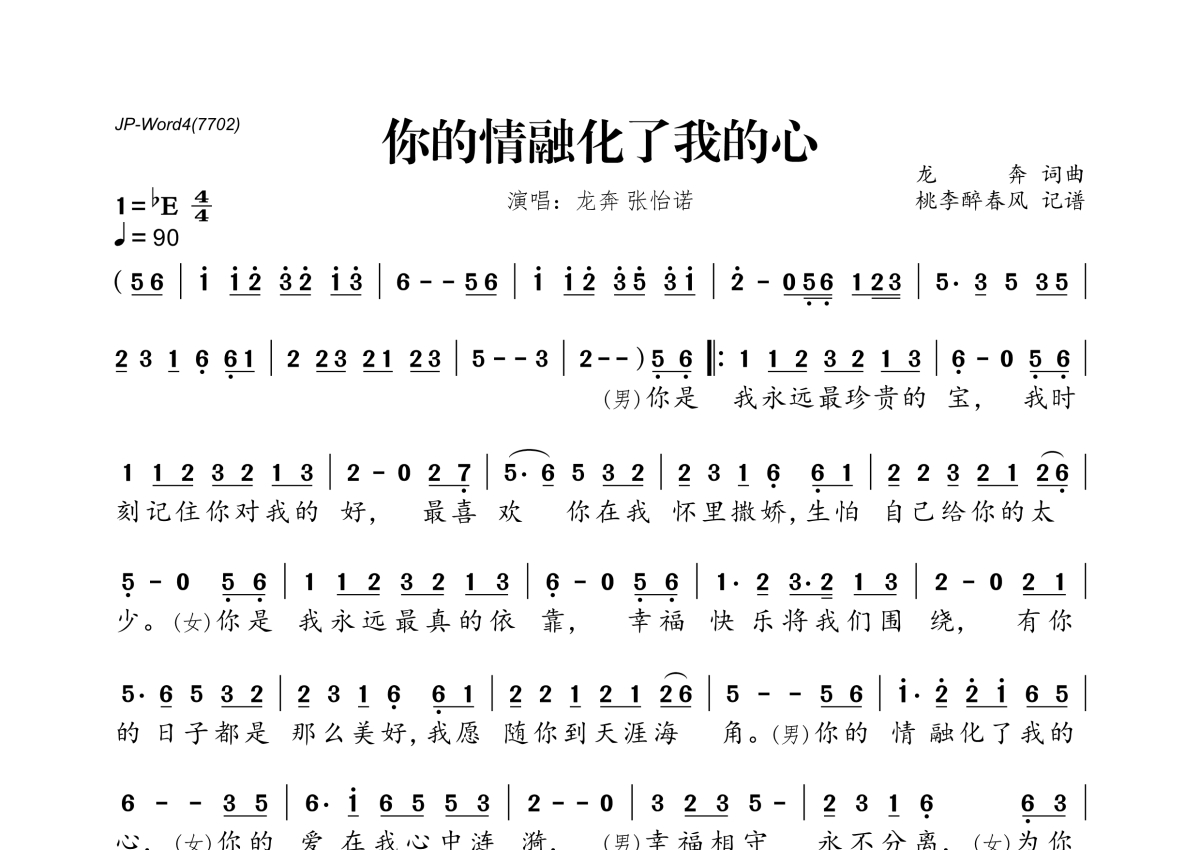 龙奔&张怡诺《你的情融化了我的心》简谱