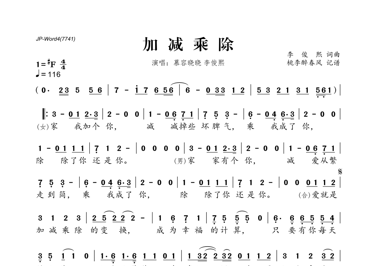 《加减乘除》是慕容晓晓、李俊熙演唱的一首歌曲,拍号为4/4拍,歌曲速度为每分钟116拍,这份简谱共有一张高清图谱,图谱由 @桃李醉春风 编配上传。