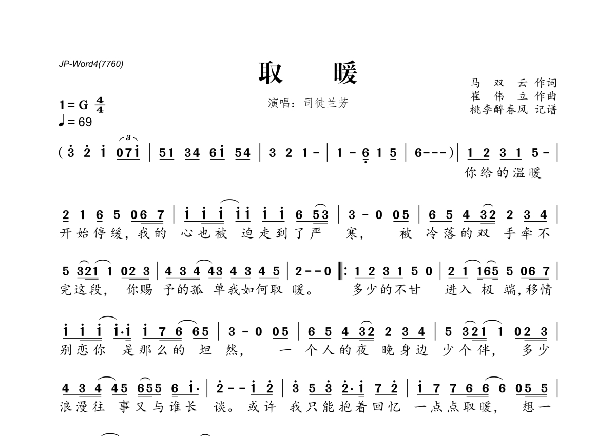 《取暖》是司徒兰芳演唱的一首歌曲,拍号为4/4拍,歌曲速度为每分钟69拍,这份简谱共有一张高清图谱,图谱由 @桃李醉春风 编配上传。